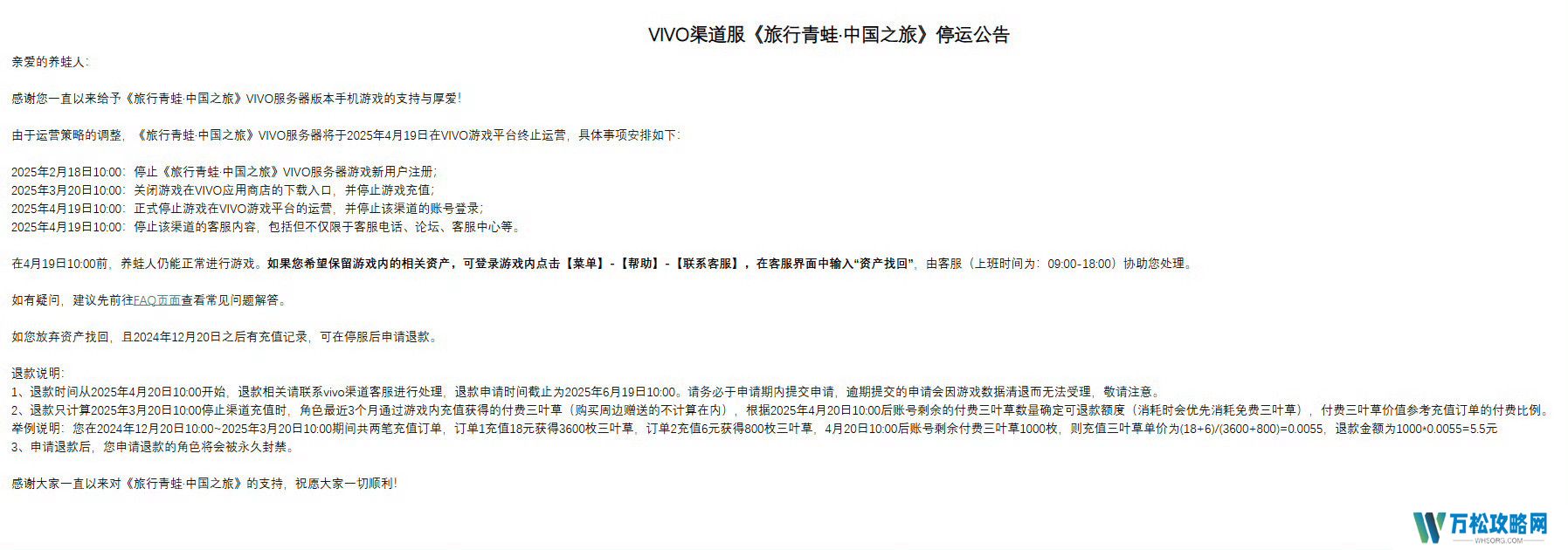 此次VIVO渠道服的停运,无疑给众多玩家带来了不小的打击。有玩家表示:“蛙还没回来,家就没了。”更有玩家担心,这是否意味着游戏将面临更大的危机。不过,游戏官方在公告中也给出了相应的解决方案,建议玩家可以联系客服处理游戏内资产的保留问题。如果玩家放弃资产找回且2024年12月20日之后有充值记录,可在停服后申请退款。