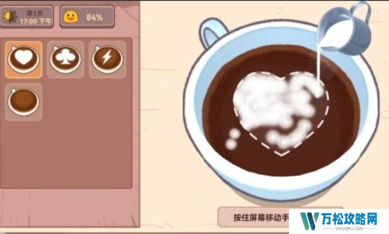 紧接着游戏的界面中就会出现拉花的杯子,点击这个杯子,让杯子随着手指滑动就可以进行拉花。出现拉花的位置就是玩家的手指滑动位置,发挥自己的想象力,手脑协调就可以随意拉出不同的造型,提升咖啡的价值。