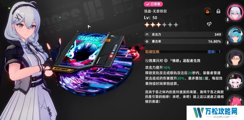 无画框是一件极具特色的武器,其精通效果与装备者的生命值状态紧密相连,当装备者生命值高于50%时,无画框能够提升攻击力,为装备者在生命值较为健康的情况下提供强大的输出能力,而当生命值低于50%时,无画框则会增加防御力,随着精通等级的提升这种攻击力和防御力的加成效果也会从精通1的攻击力和防御力提升36%,到精通5的提升72%。