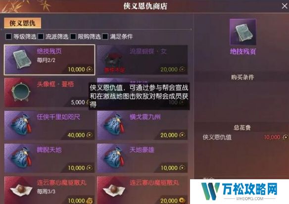 3、参与帮战或野外敌对后在【侠义恩仇商店】每月兑换2个。