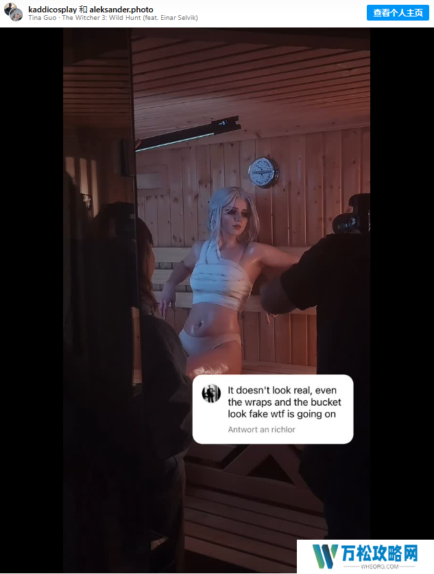 这位德国Coser“@kaddicosplay”最近以希里为主题进行了Cosplay,展现了类似的缠胸造型享受桑拿,光滑的肌肤在汗水的映衬下显得格外迷人,许多网友甚至误以为这是CG或AI生成的照片。