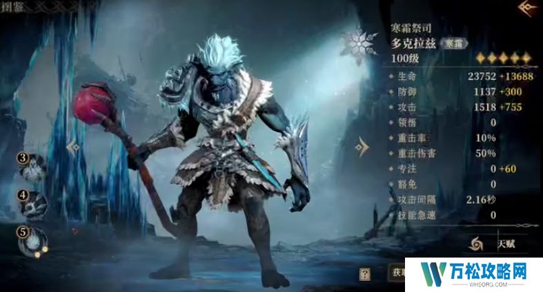 首先是多克拉兹这位史诗英雄,他的被动技能相当独特且实用,能够让普通攻击有60%的概率形成追加伤害,并且会对目标施加长达5秒的寒霜效果。值得注意的是,这个技能在攻击时会优先选择未处于寒霜状态的目标,他的战技也非常强大,能够对范围内的敌人造成280%的冷冻输出值,同时有75%的几率施加寒霜效果,不仅如此使用战技后还能增加自身25%的威能,而他的威能技更是威力惊人,会向目标区域丢出冰球,对范围内敌人造成520%的冷冻伤害,如果此招对处于寒霜状态的敌人产生了输出值,那么还会对自己施加15%的攻击增加效果,并且这个效果能够持续10秒。
