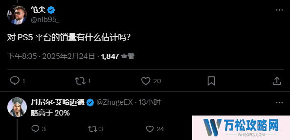 不过也有玩家好奇这份总销量在各个平台的分布如何,对此游戏市场调研公司Niko Partners 的总监 Daniel Ahmad 回复表示,他们预测的PS5销量份额占比略高于20%,也就是说大约有560万份来自于PS5平台。