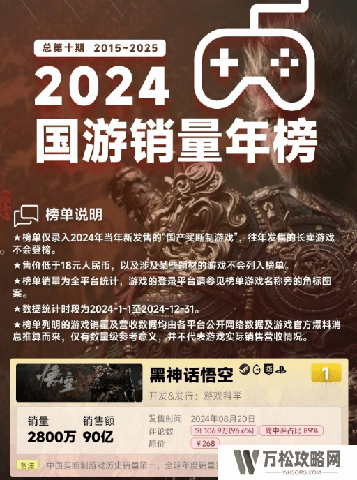 而根据微博账号“国游销量榜”发布的2024年国游销量年榜统计的数据表明,截止2024年12月31日,《黑神话:悟空》总销量达到了惊人的2800万份。