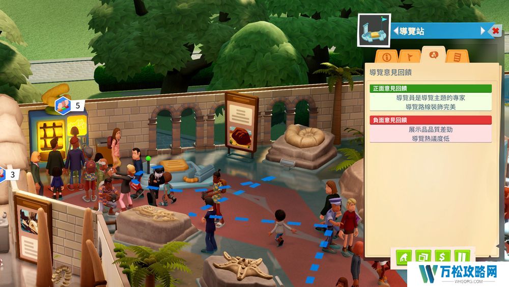 在《双点博物馆》中,导览功能允许玩家通过安排导览活动来增加博物馆的收入,同时提升访客的“热议度”和“知识”。玩家需要设置“导览站”,并聘用导览专家,制定导览方案和路线,以提供给访客良好的体验。一旦导览站吸引到足够的参与者,导览活动就可以开始。参与导览的访客将会在专家的引导下,获得丰富的知识和热议度奖励。这些导览结束后,访客根据体验给予评价,导览的评价越高,博物馆获得的捐款也会越多,确保玩家能通过优化导览提高整体收益。