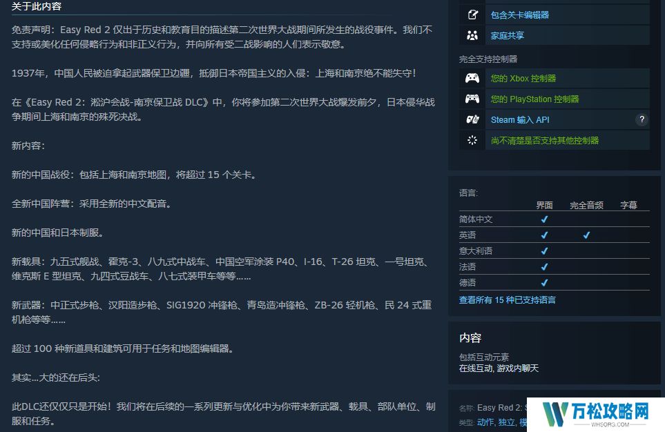 从商店页面的简介可知:1937 年,日本帝国主义悍然入侵,中国人民为了保卫边疆,不得不奋起反抗,因为上海和南京绝不能落入敌手!在《Easy Red 2:淞沪会战 - 南京保卫战 DLC》里,玩家将置身于第二次世界大战爆发前夕,亲身体验日本侵华战争期间,发生在上海和南京的那场惊心动魄的殊死决战。