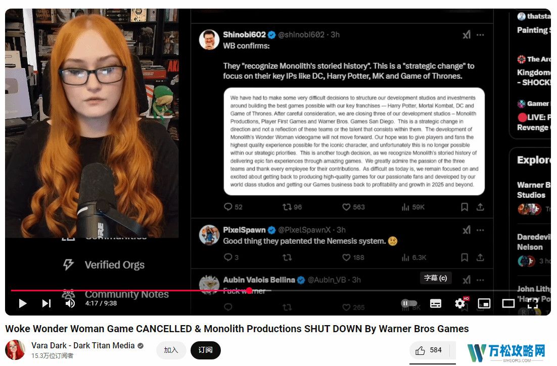 《神奇女侠》游戏的取消在玩家中引发了广泛讨论。国外知名游戏评论员Vara Dark通过视频对华纳兄弟的游戏业务现状进行了点评。她指出,华纳兄弟的游戏业务近年来一直处于动荡之中,多个游戏项目表现不佳,其中包括《多元宇宙大乱斗》和《自杀小队:杀死正义联盟》等作品,这些项目的亏损已经让华纳的游戏业务减值超过3亿美元。而《神奇女侠》的取消无疑让这一局势雪上加霜。