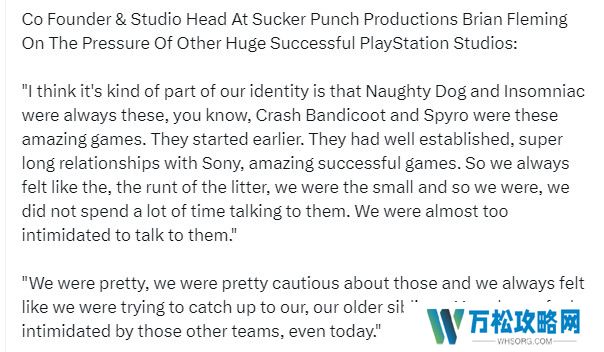 近期,《对马岛之魂(Ghost of Tsushima)》的制作团队Sucker Punch的负责人Brian Fleming在一次访谈中坦诚表示,与索尼旗下的其他杰出工作室相比,他们感受到了巨大的压力。