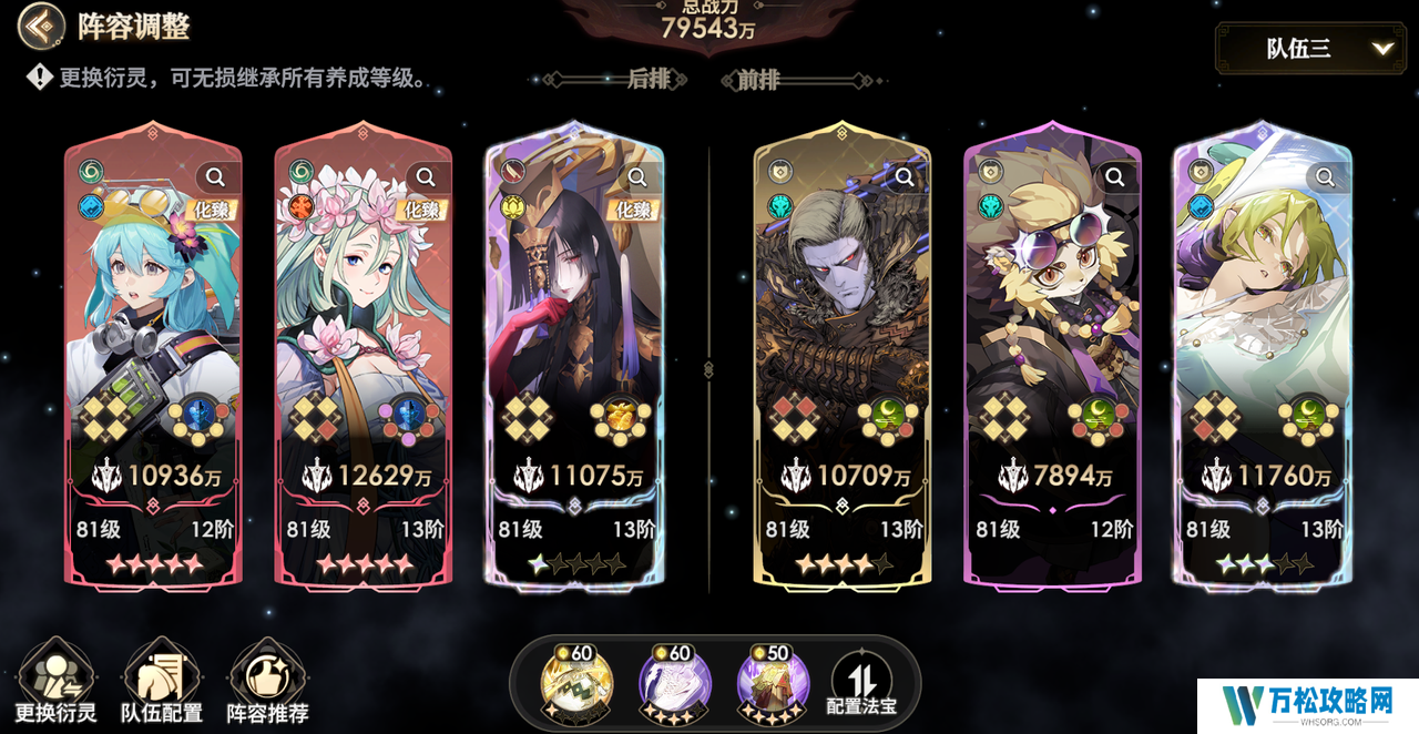 终极**五保一阵容,虽然因为包含3个化臻衍灵养成成本极高,但是其对应的保护和续航能力也会到达五保一的巅峰。前排3盾体系在牛魔王连携的加持下,拥有远超其他非3盾前排的坦度。配合后排百花羞的额外治疗效果加成和120%高系数的横排治疗能力将前排的续航能力也提升到了极致,百花羞的连携、孟婆的治疗和**王自身的吸血能力也能保证后排自身的续航。同时黄狮精的减伤光环和控制、多闻天王的全体护盾、牛魔王的减敌方最终伤害等都能对整体阵容提供保护,让**王在所有人的保护下,有极好的输出环境。