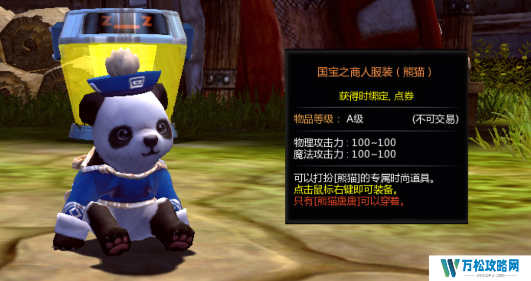 熊猫糖糖在游戏当中的外形也是可以任意玩家DIY的,玩家可以在商城之中,通过购买外观的方式,来丰盈熊猫堂堂的外形设置,熊猫糖糖的打扮效果,也会给其附加有基础攻击力,例如,当熊猫糖糖使用国宝之商人服装时,物理攻击力可以叠加到一百, 魔法攻击力可以提升到一百,这对熊猫糖糖而言是极强的战斗力提升~