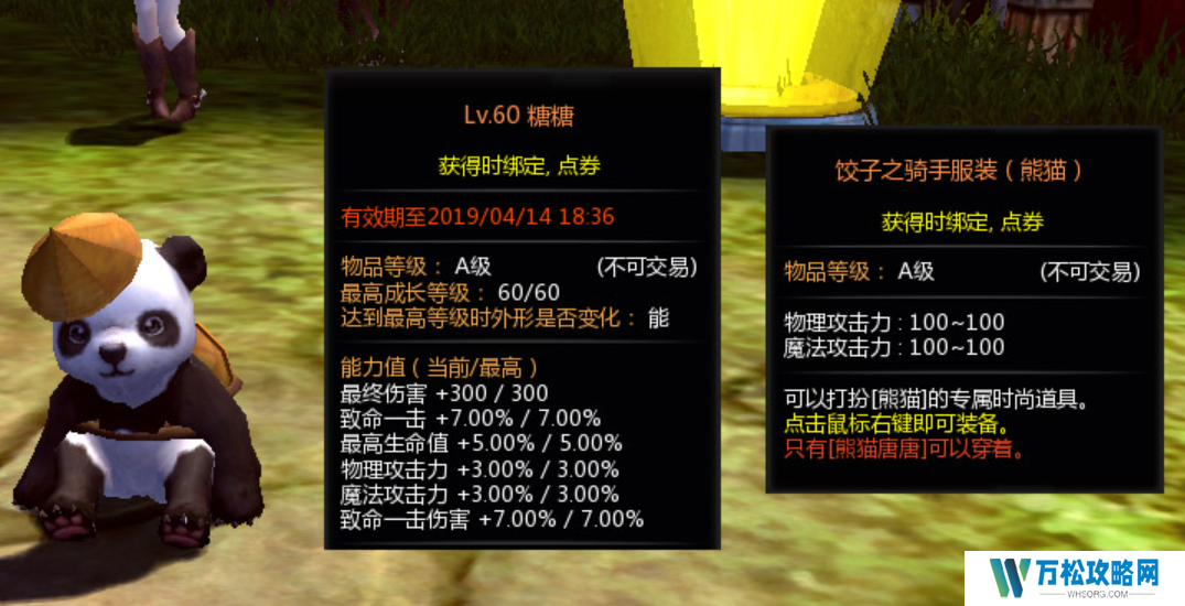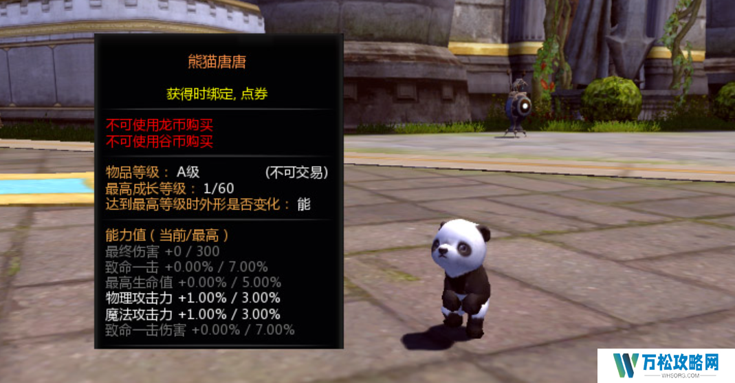 熊猫糖糖是一个特殊宠物,它的等级是金色,并且最高可以提升到六十级, 其能力值在初始状态下,附带有1%的物理攻击力加成以及1%的魔法攻击力加成,随着等级不断提升,熊猫糖糖的最终伤害数值会提升到三百点,致命一击的伤害可以达到7%。