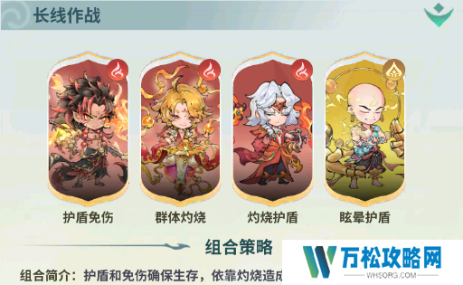 优势:唐僧提供全体增益(持续治疗、抵御、完全抵抗、免伤提升、抗暴提升中随机一个)和给重要输出角色提供护盾,并且攻击概率附加眩晕,保证己方的站场。另外三名【灼烧大将】攻击附加灼烧的同时也能给自身或者全体附加护盾等增益,敌方只能败于灼烧的折磨。
