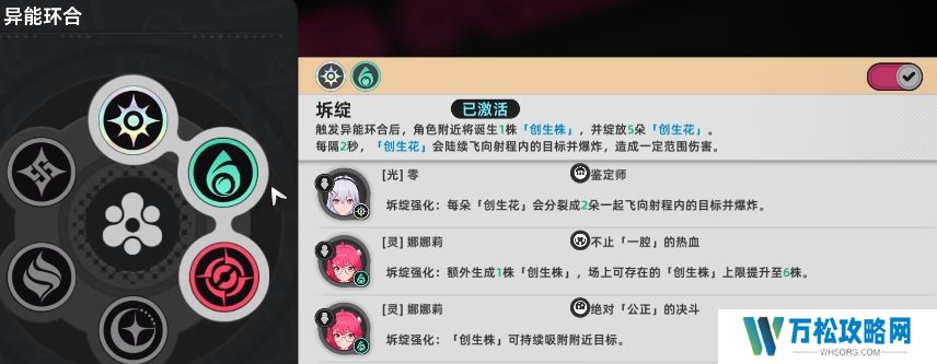 当玩家拥有三个或六个觉醒时,还可以激活强大的共鸣效果,还有异能环合的效果主要体现在角色的入场技上,例如当固定属性的角色获取了一定的环合数值之后,大家切换另外一个角色就会触发坼绽效果,即所谓的光灵反应,此时角色附近将诞生1朵创生株,有范围性的伤害,每个角色的环合效果和环合系数都各不相同,环合系数100意味着释放该技能后可以立即触发异能环合,也就是角色定位中的即瞬环合。