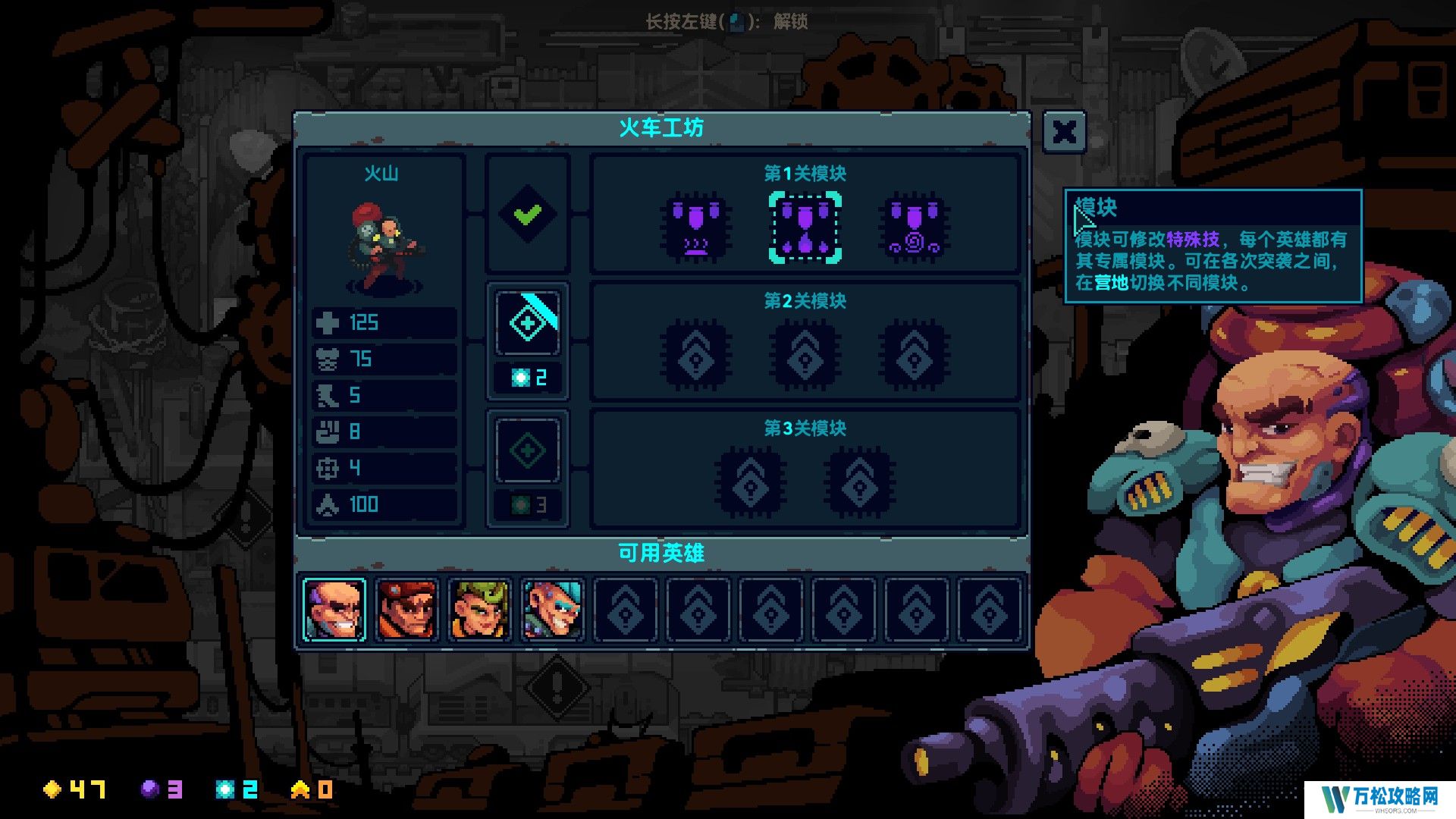 在任务中获取的一些点数,则可以在火车工坊升级角色的一些模块,不同的模块有不同的效果。比如游戏角色“火山”他的第一模块就可以在子弹上提供不同特殊效果,如:使地上产生酸液,使目标燃烧或使目标眩晕。这样的强化也使得游戏难度降低一些。