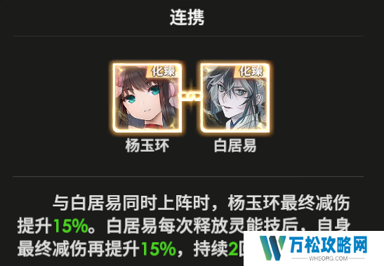 与白居易同时上阵时,杨玉环最终减伤提升15%。白居易每次释放灵能技后,自身最终减伤再提升15%,持续2回合。