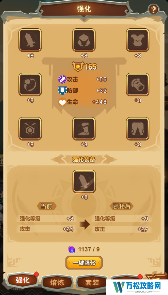 一、装备可以使用强化石来提高属性,强化等级越高提升的属性也越高。