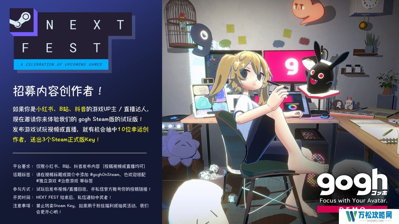 为庆祝体验版上线及参与“Steam Next Fest”,我们特别推出针对视频创作者的正式版游戏赠送活动。凡参与《gogh: Focus with Your Avatar》体验版的游戏直播,或发布游戏视频的视频创作者,将有机会通过抽奖获得3份正式版游戏的激活码。活动详情请参考相关图片说明。