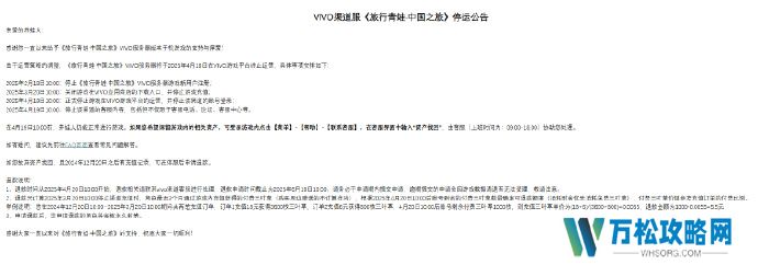 近日,《旅行青蛙》手游官网发布一则停运公告:由于运营策略调整,《旅行青蛙·中国之旅》VIVO服务器将在4月19日终止运营,玩家可申请退款。 不过,这并不意味着整个游戏停止运营,只是原先在VIVO