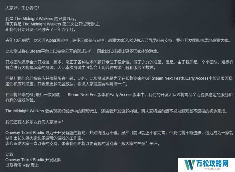 Oneway Ticket Studio正在 Steam 平台上举办 PvPvE 游戏《午夜行者(The Midnight Walkers)》的第二次公开测试,测试时间为 2 月 24 日至 3