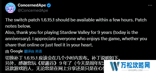 今天是《星露谷物语(Stardew Valley)》发售9周年纪念日,制作人ConcernedApe在社交媒体发文祝贺,并感谢玩家一直以来的支持。 《星露谷物语》最初于2016年2月27日发售,