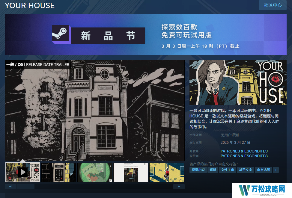悬疑解密视觉小说新作《YOUR HOUSE》近日上架Steam,官方宣布该作将于3月27日正式发售,登陆iOS、Android、PC平台,该作目前已经开放免费试玩,暂不支持中文。 游戏简介: